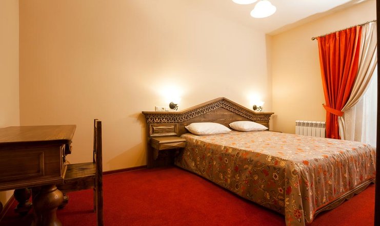 В номере: вешалка, диван раскладной, зеркало, кровать двуспальная, прикроватные тумбочки, стол, стулья, шкаф, кондиционер, мини-холодильник, телевизор ЖК