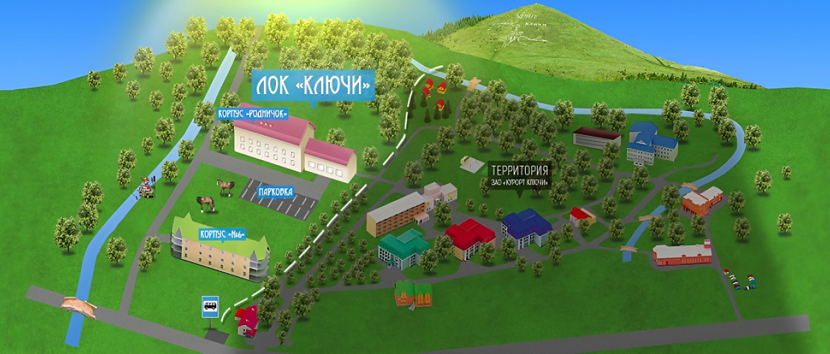 Территория учреждения граничит с ЗАО «Курорт Ключи», но имеет собственную, полностью обособленную инфраструктуру: жилые корпуса, лечебную базу и просторную столовую.