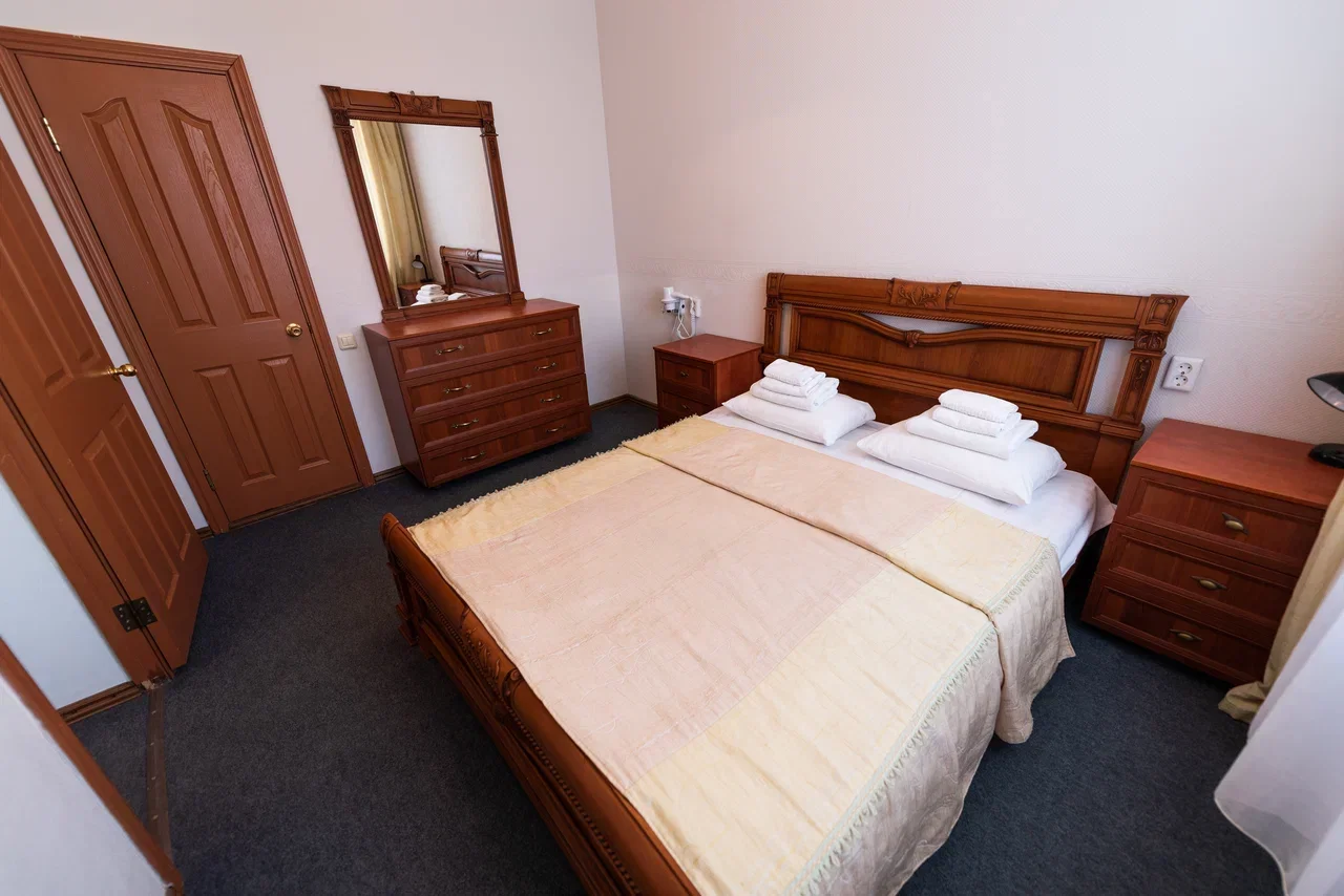 Оснащение номера: две односпальные кровати, прикроватная тумбочка, стол, стулья, шкаф, комод, диван, журнальный стол, телевизор, холодильник, чайный набор посуды, электрочайник